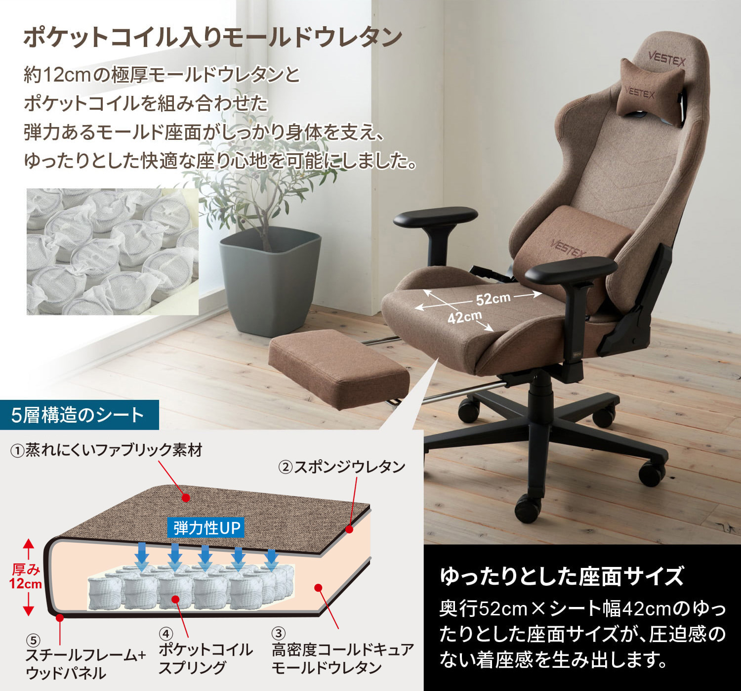 座面にポケットコイル入りモールドフォームを使用し弾力ある座面が特徴。日本人の平均的な身長に合わせて設計した低座面仕様。通気性の良いファブリック生地はリビングに合わせやすい落ち着いた4色のカラーバリエーション。高機能ワークチェアとしてもおすすめできるライフスタイルゲーミングチェアです。